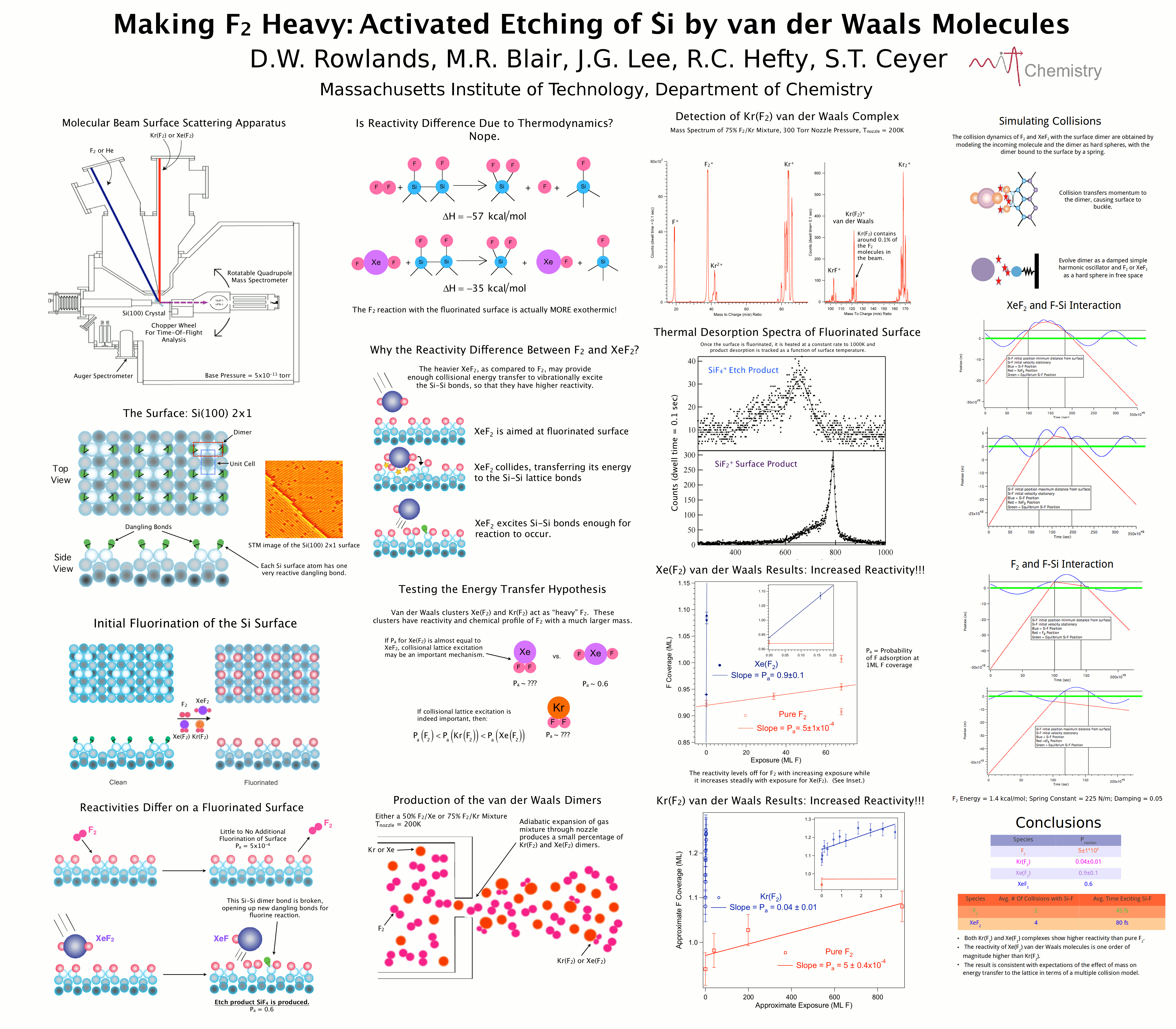 DW Rowlands, Michael R. Blair, Jae-Gook Lee, Robert Hefty, & Sylvia T. Ceyer. “Making F2 Heavy: Activated Etching of Si by van der Waals Molecules,” Poster at Gordon Research Conference on Dynamics at Surfaces (2013).